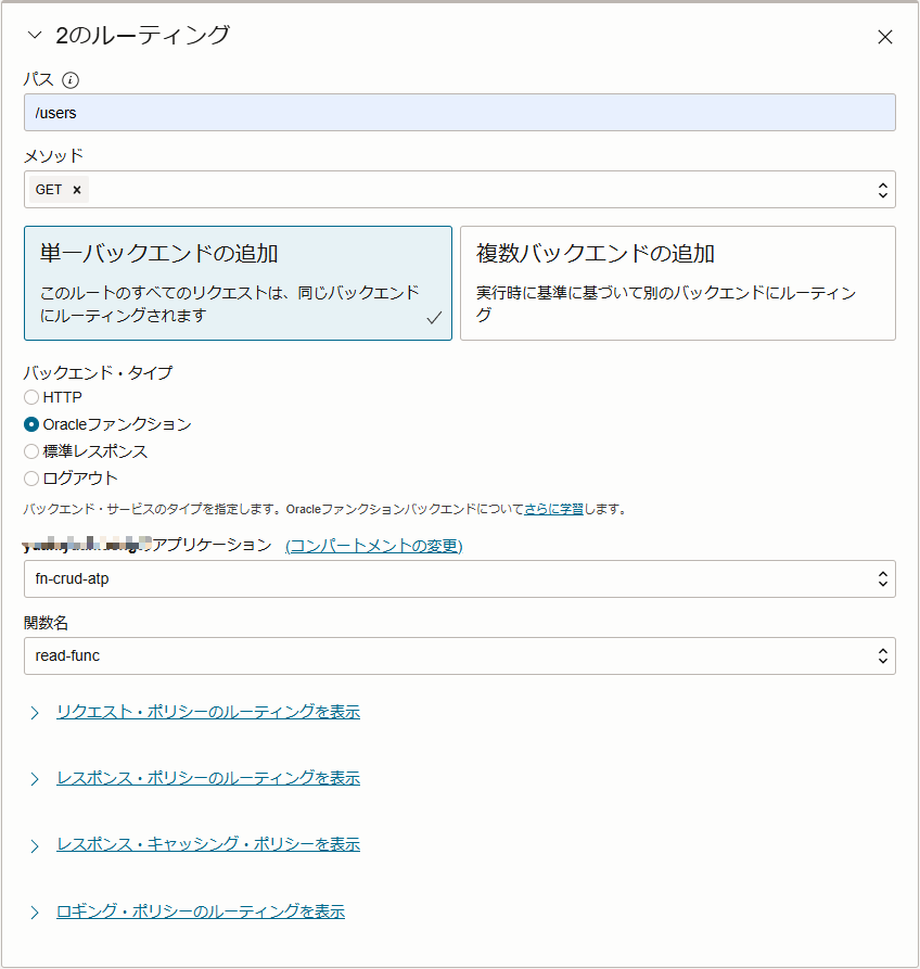 コンパートメント:OCI API Gatewayリソースを作成するコンパートメントの名前(こちらのワークショップではFunctionと同じコンパートメントを指定してください)