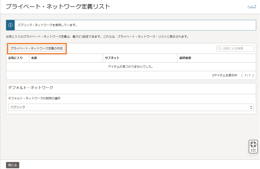 プライベート・ネットワーク定義リストのページが開くので、「プライベート・ネットワーク定義の作成」を選択します。