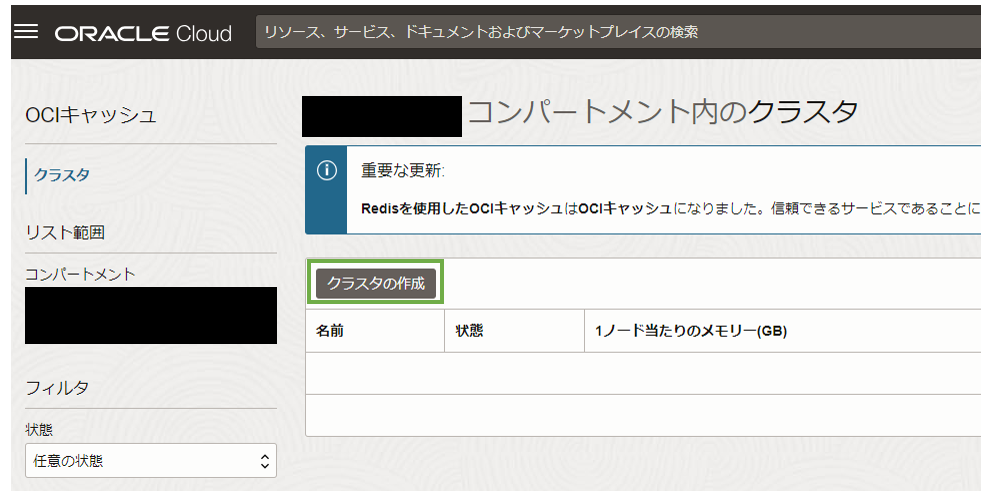 OCIキャッシュのクラスタ画面が開いたら、クラスタの作成を選択します。