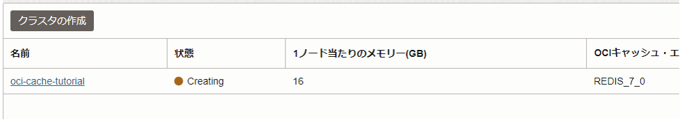 状態がActiveとなれば作成完了です。oci-cache-tutorialをクリックし、クラスタの詳細ページに移動しておきます。