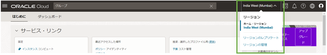 まずはリージョンをホームリージョンに設定します。画面右上のリージョン選択ボタンをクリックし、現在選択されているリージョンがホームリージョンであることを確認します。ホームリージョンでない場合は、ホームリージョンを選択してリージョンを変更します。