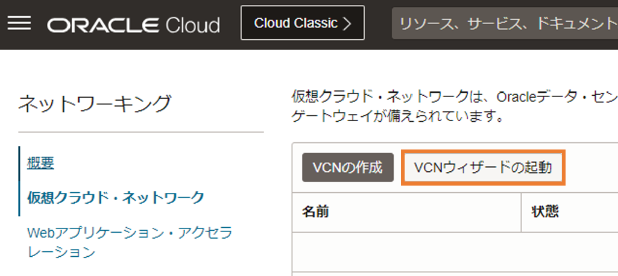 今回は簡単にVCNを作成するため、「VCNウィザードの起動」を選択します。