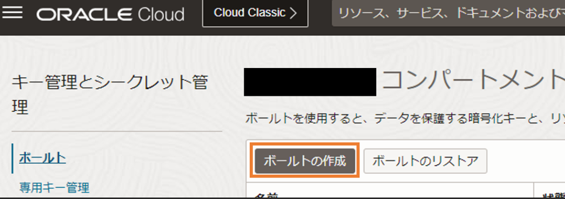 画面左上のハンバーガーメニューから、「アイデンティティとセキュリティ」を選択し、「キー管理とシークレット管理」の中にある、「ボールト」を選択します。