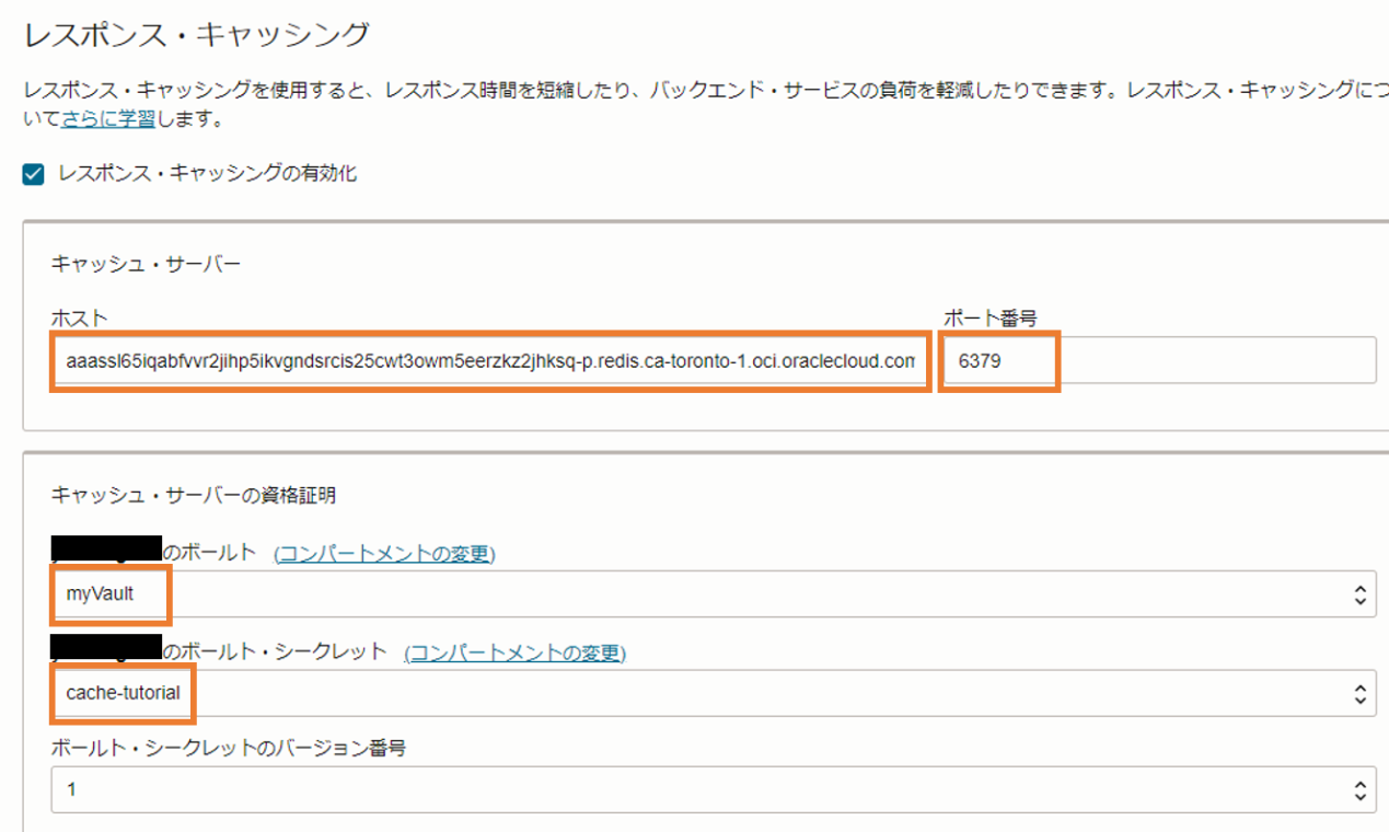 - キャッシュ・サーバーのホスト:控えておいたOCI Cacheのエンドポイント