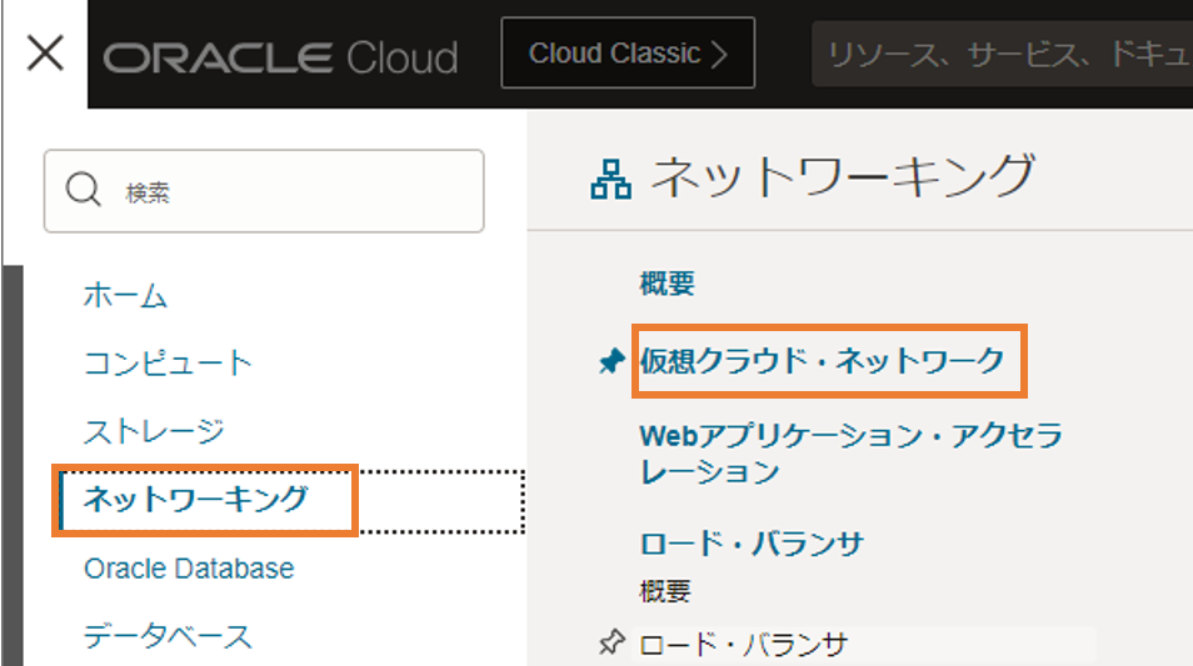 まずは今回のリソースを配置するVCN(仮想クラウドネットワーク)を作成します。OCIコンソールの左上のハンバーガーメニューから、「ネットワーキング」を選択し、「仮想クラウド・ネットワーク」を選択します。