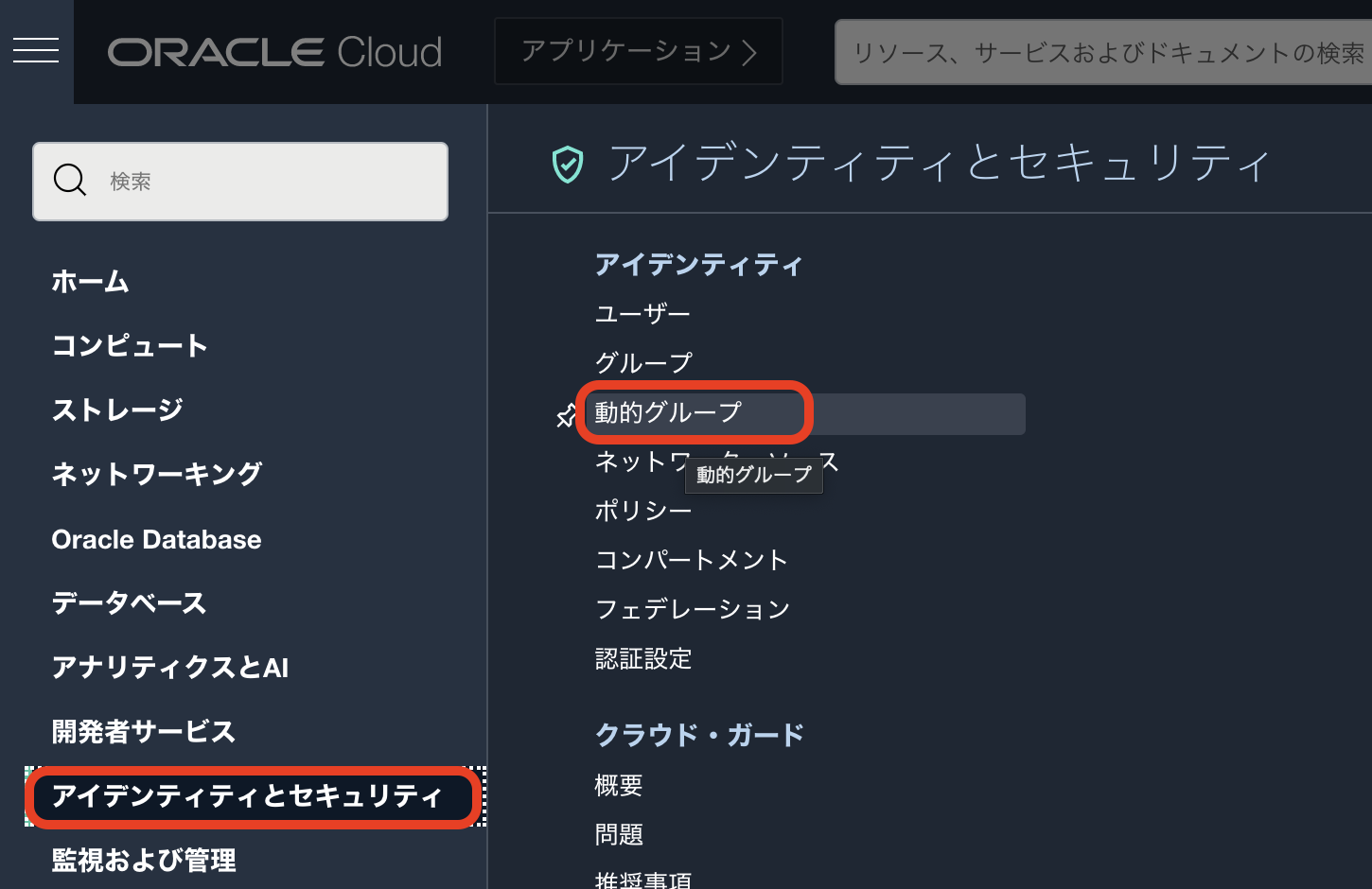 OCIコンソールのハンバーガーメニューを開き、「アイデンティティとセキュリティ」から「動的グループ」を選択します。