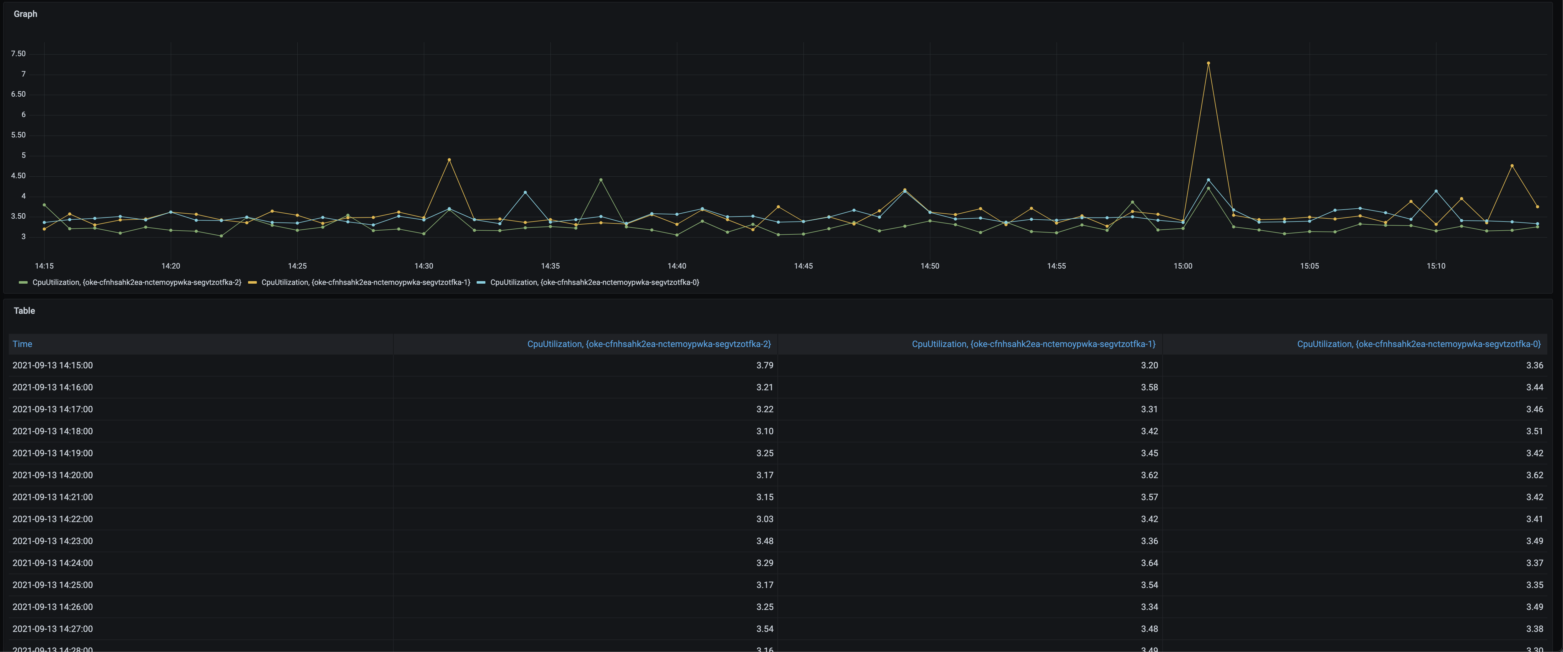 このようにOCI MonitoringのGrafanaプラグインを利用すると、OCIのCompute(今回の場合はOKEのWorker Node)のメトリクスをGrafanaダッシュボードに統合することができます。