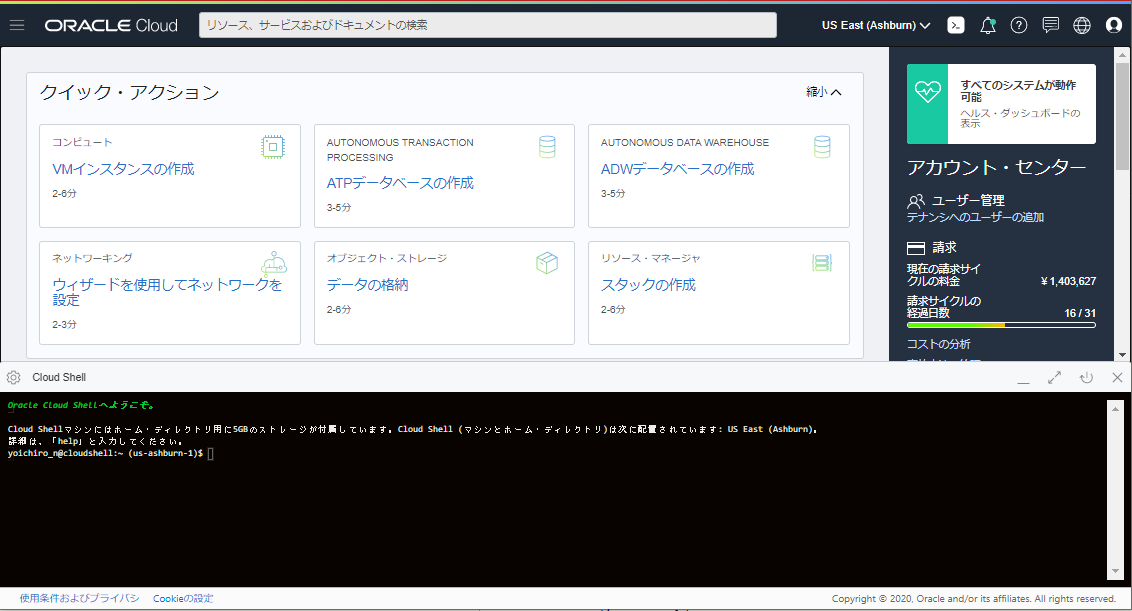 Oracle Cloud Infrastructureは、北米、東京を含む多数のデータセンターを利用可能です。ここではアカウント作成時に設定されたホームリージョンのまま、手順を進めていきます。