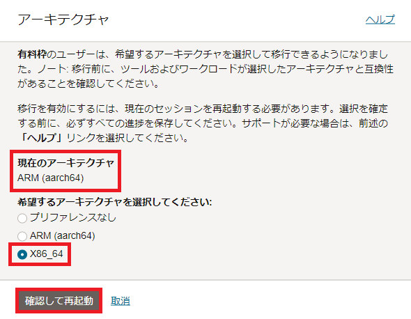 「現在のアーキテクチャ」が ARM(aarch64) の場合は、X86_64 を選択して、「確認して再起動」ボタンをクリックします。