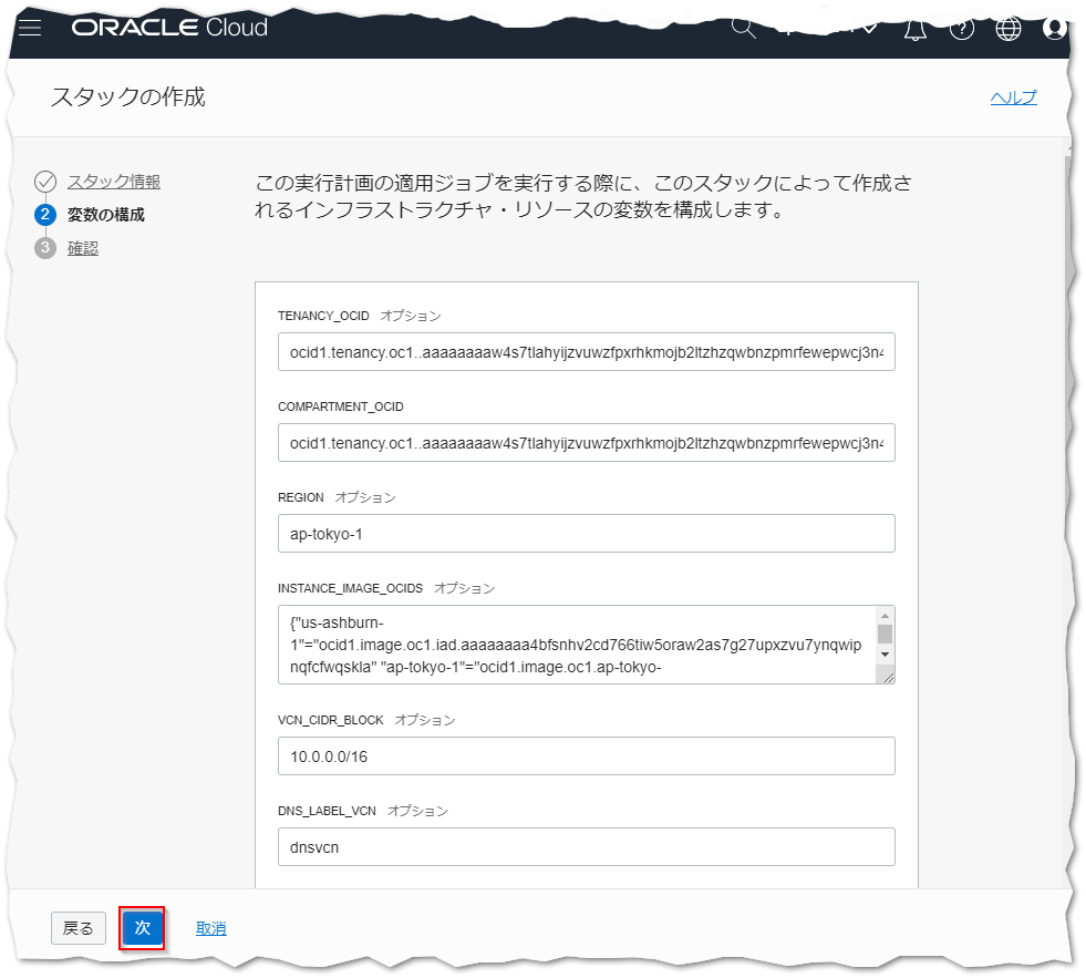 Resource Managerが自動的に各環境毎のTENANCY_OCIDとCOMPARTMENT_OCIDとRegionの変数に適切な値を投入します。変数が投入されていることを確認し、次をクリックします。