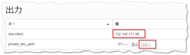 ここでは、ジョブを実行した結果作られたリソースに関連する情報を、確認することができます。ここまで正常に完了していれば、oke-clientとprivate_key_pemという情報が表示されているはずです。これらは、それぞれCLI実行環境のIPアドレスとSSH秘密鍵です。