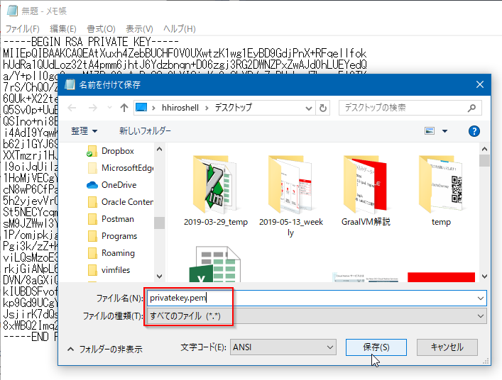 private_key_pemの値は、コピーという部分をクリックするとクリップボードに値が保存されます。こちらは、新たにテキストエディタを起動してペーストし、「privatekey.pem」というファイル名で保存しておいてください。