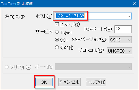 次に、デスクトップにあるTera Termのショートカットアイコンをダブルクリックし、Tera Termを起動します。「Tera Term: 新しい接続」というダイアログが表示されたら、ホストに上の手順で控えたIPアドレスを入力し、OKをクリックします。