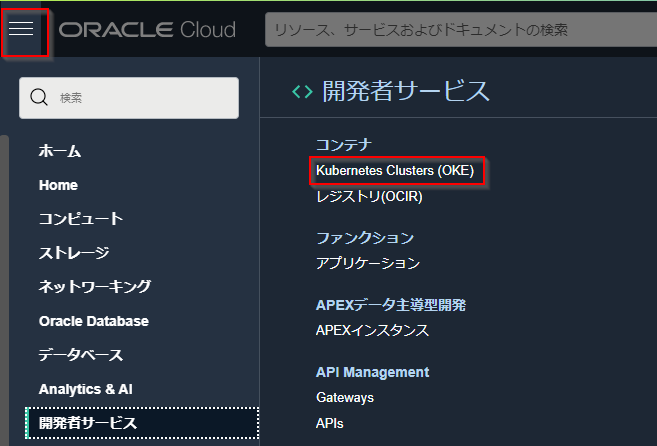 OCIコンソール画面左上のハンバーガーメニューを展開し、開発者サービス⇒Kubernetes Clusters (OKE)を選択します。