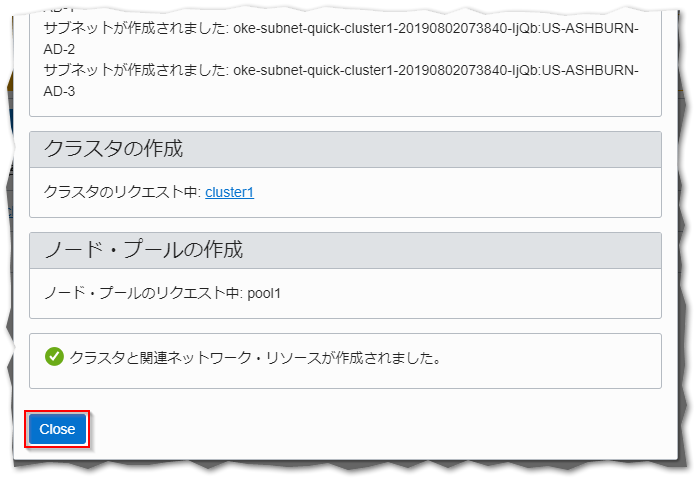 デフォルトの設定では、クラスタが必要とするネットワークリソース等の構成が自動的に行われます。途中経過がダイアログに表示されますので、「クラスタと関連ネットワーク・リソースが作成されました」というメッセージが表示されるまで待った後、Closeボタンをクリックします。