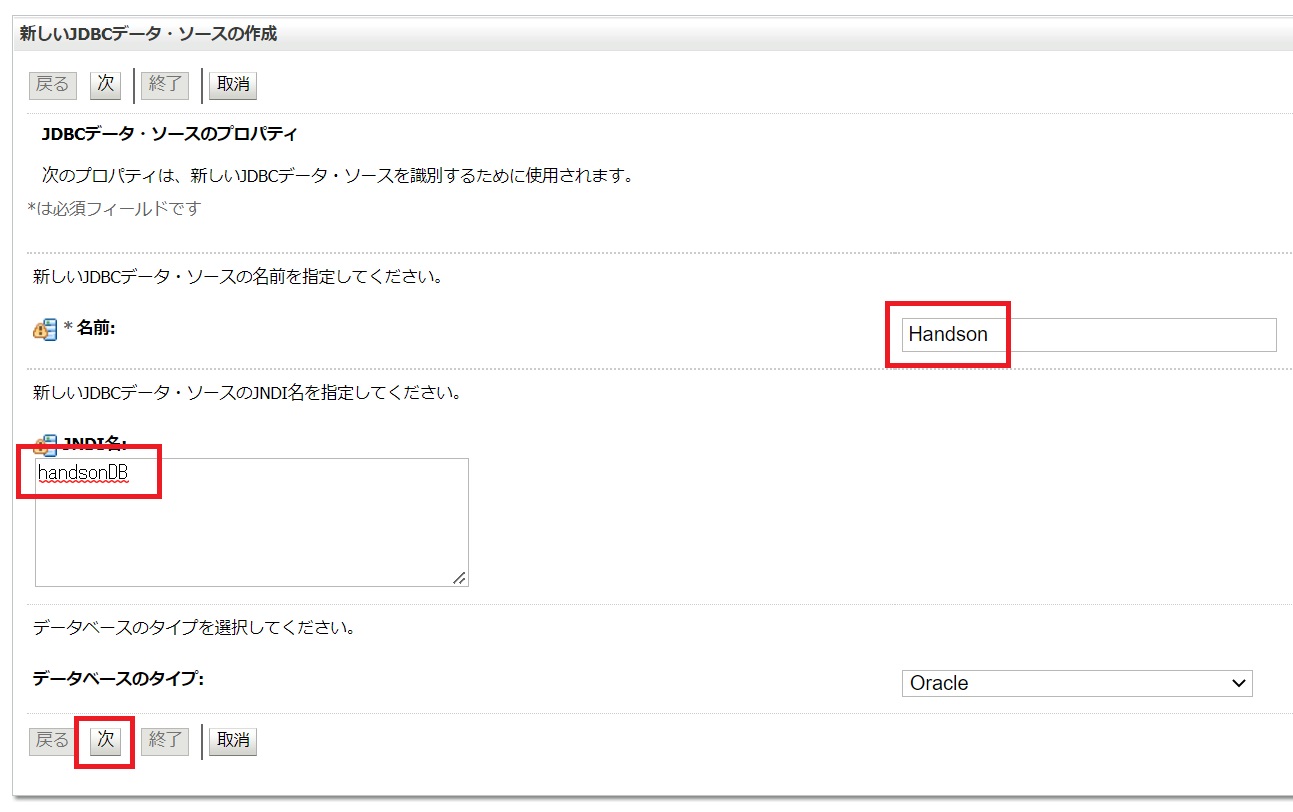 「名前」に「Handson」と入力し、「JNDI名」に「handsonDB」と入力し、「次」をクリックします。