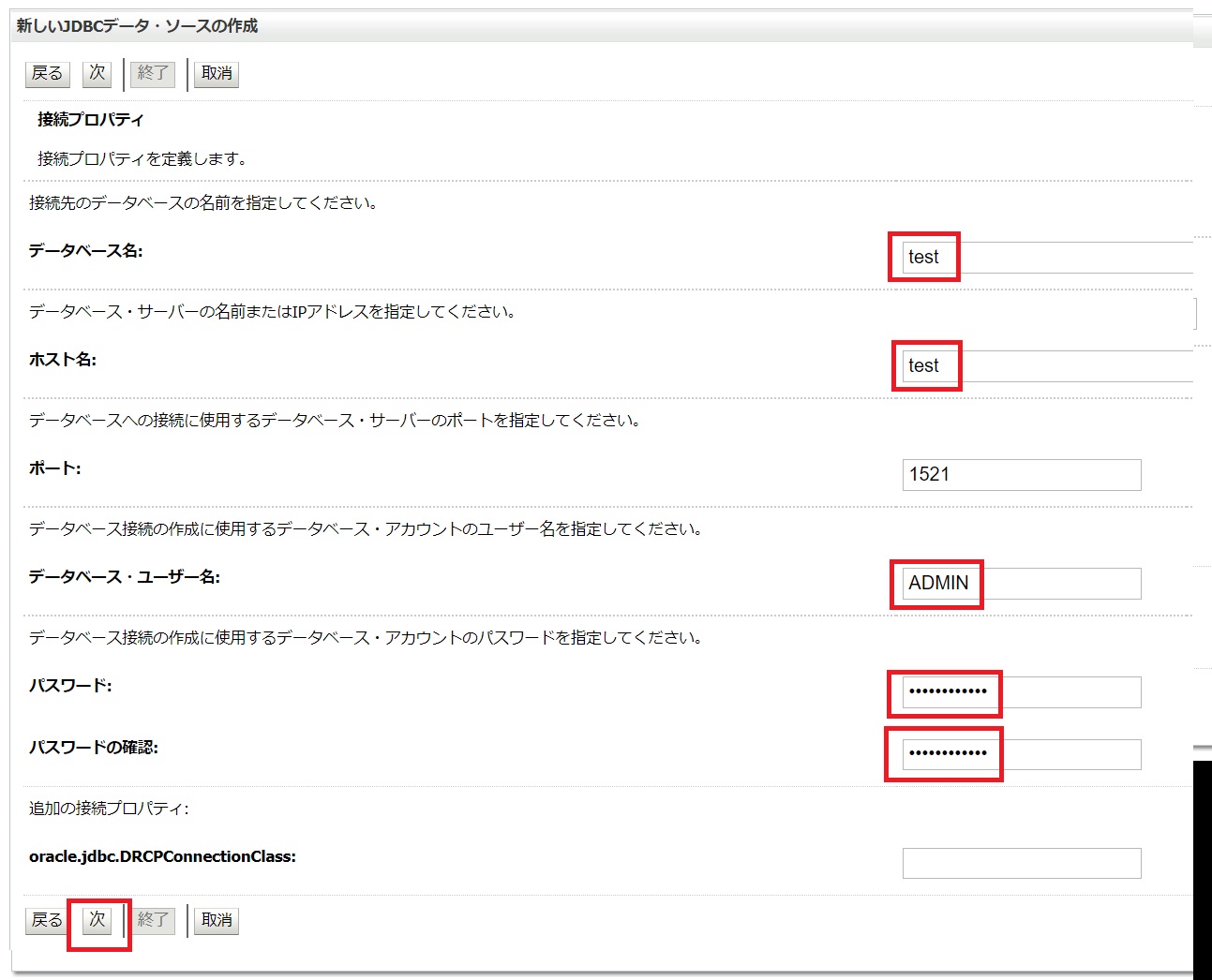- WebLogicにデータベースの設定を行います