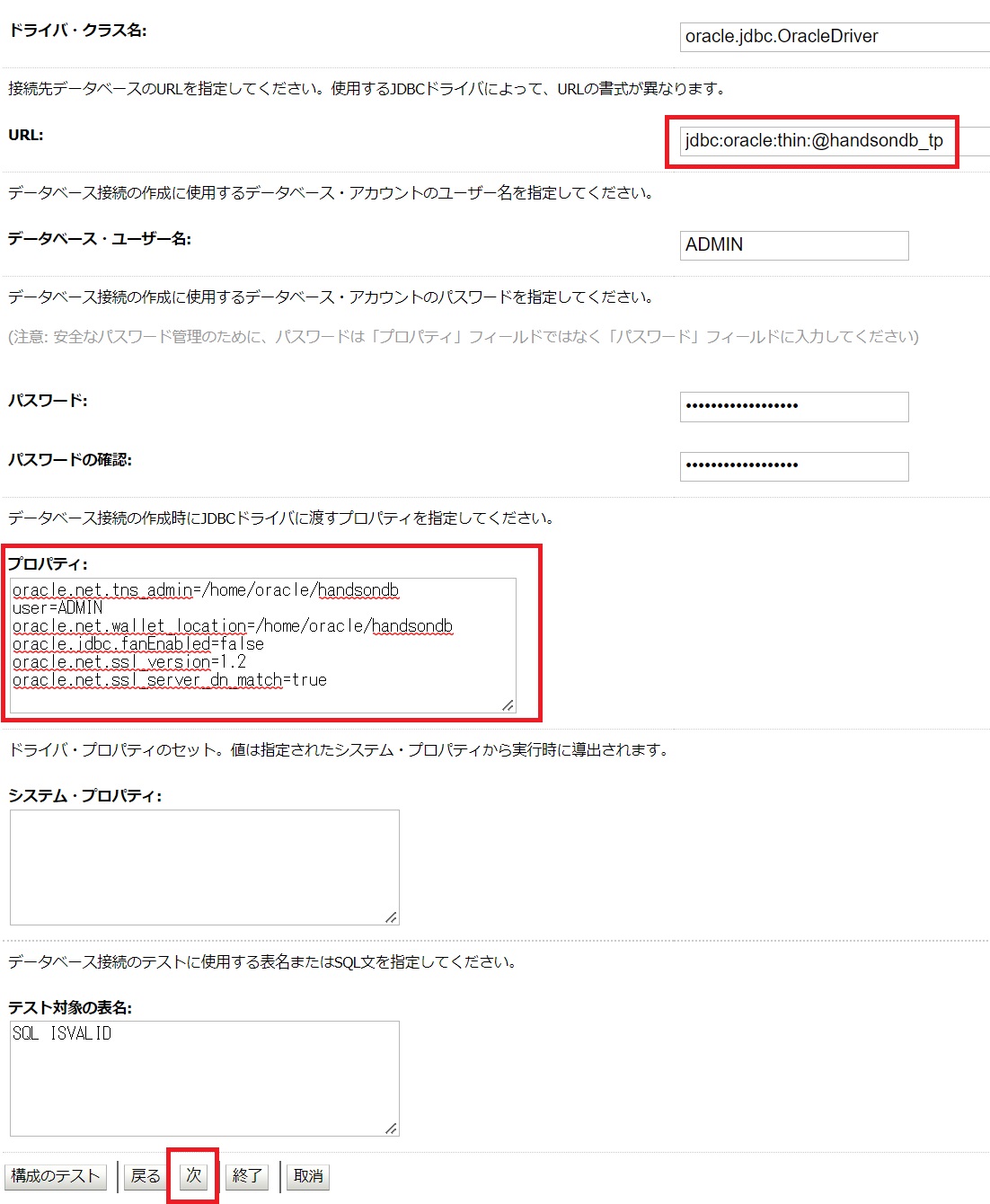 URLにjdbc:oracle:thin:@handsondb_tpと入力し、プロパティに