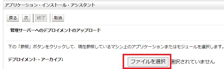 「デプロイメント・アーカイブ」の「ファイルを選択」をクリックします。