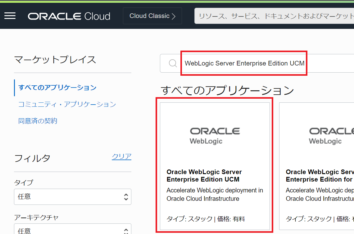 検索欄に「Oracle WebLogic Server Enterprise Edition UCM」と入力し、先頭に出てくるパネルをクリックします。