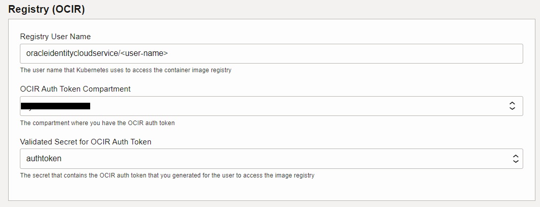「Registry (OCIR)」の情報を入力します。 Registry User NameにはOCIRのユーザ名を入力します。※ここで入力するユーザ名はテナンシ名を含まない以下のいずれかのフォーマットで入力します。