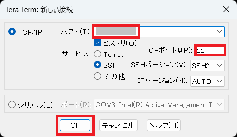 - パスフレーズ - 秘密鍵にパスフレーズが設定されている場合は指定してください。 下記は Tera Term を利用した場合の接続の設定例です。
