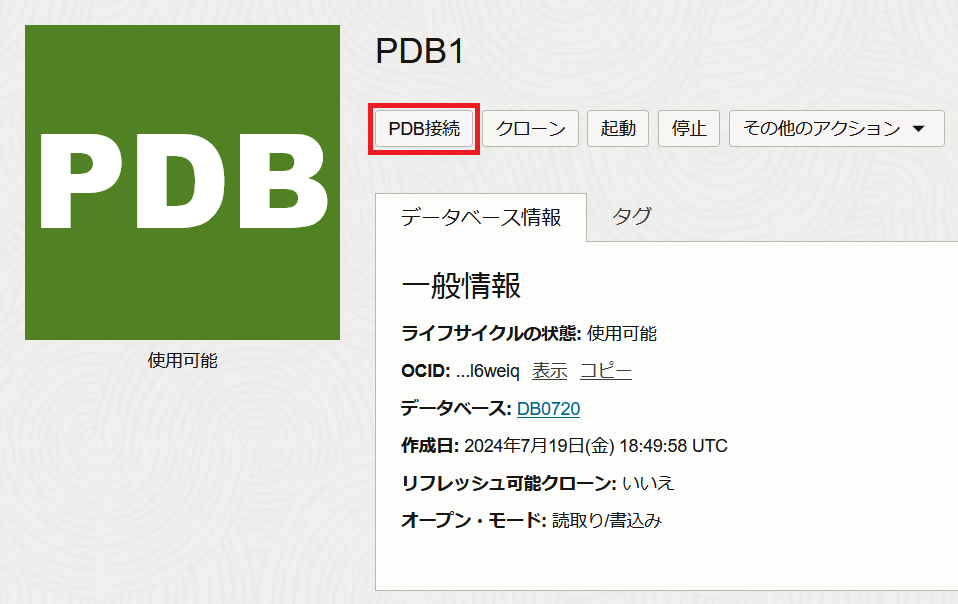 プラガブル・データベースの一覧から接続したいPDBの名前をクリックします。