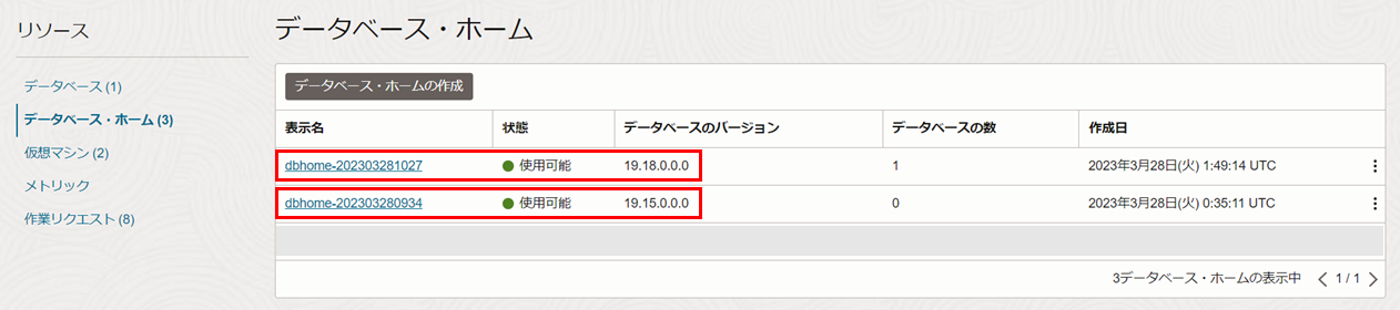 移動(パッチ適用)が完了すると、データベース・ホームの状態が使用可能に切り替わり、移動されたデータベース・ホームのデータベースの数が1に変更されます。