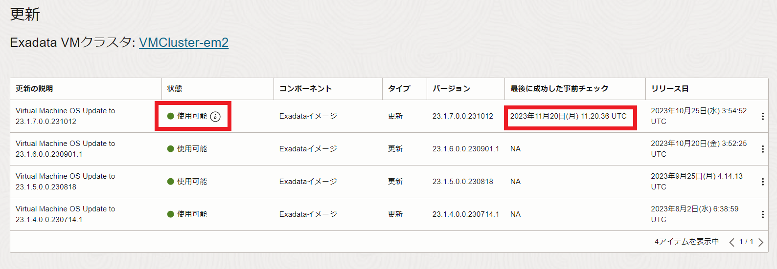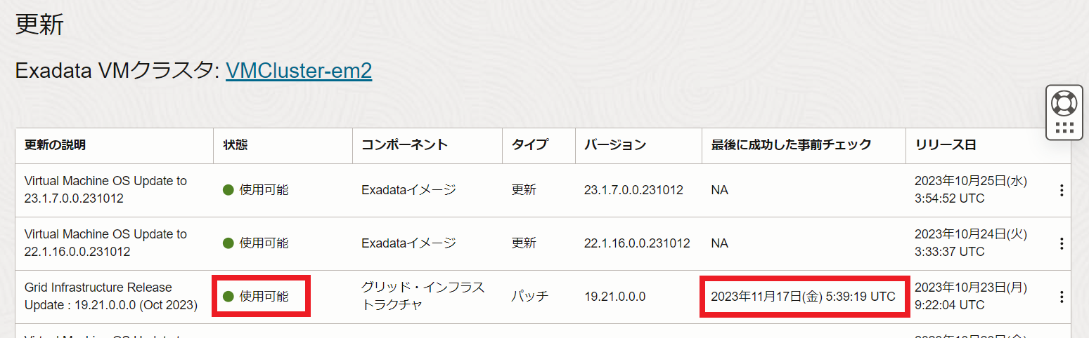 Exadata VMクラスタの詳細ページに戻ると、状態が更新中となっています。使用可能に切り替わるまで待機します。 パッチはDBサーバーへのローリングで適用されます。