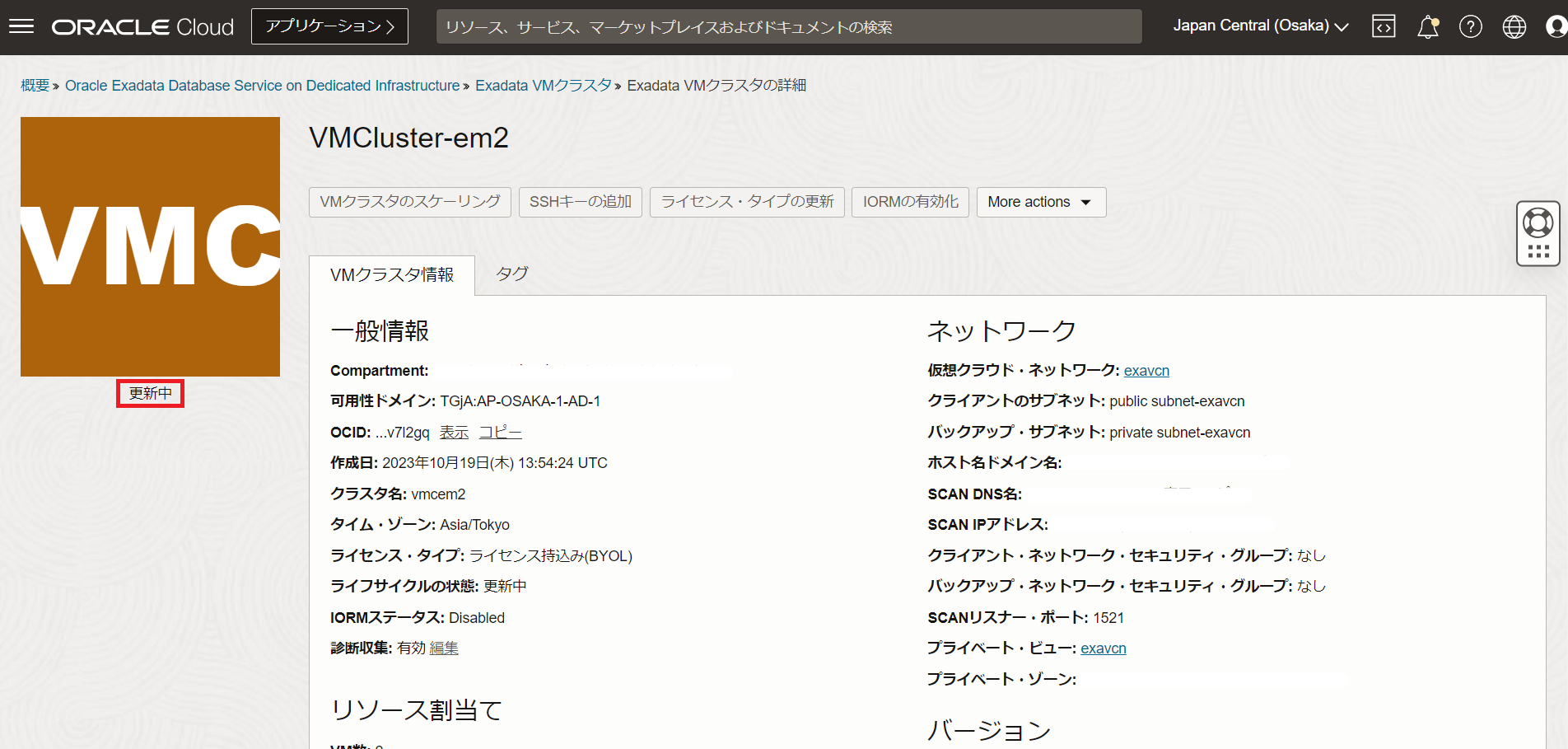 Exadata VMクラスタの詳細ページに戻ると、状態が更新中となっています。使用可能に切り替わるまで待機します。パッチはDBサーバーへのローリングで適用されます。