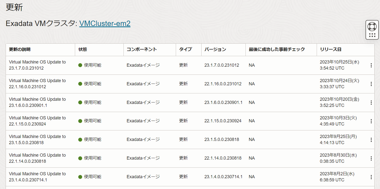 Exadata VMクラスタの詳細ページに戻ると、状態が更新中となっています。使用可能に切り替わるまで待機します。パッチはノード間でローリングで適用されます。
