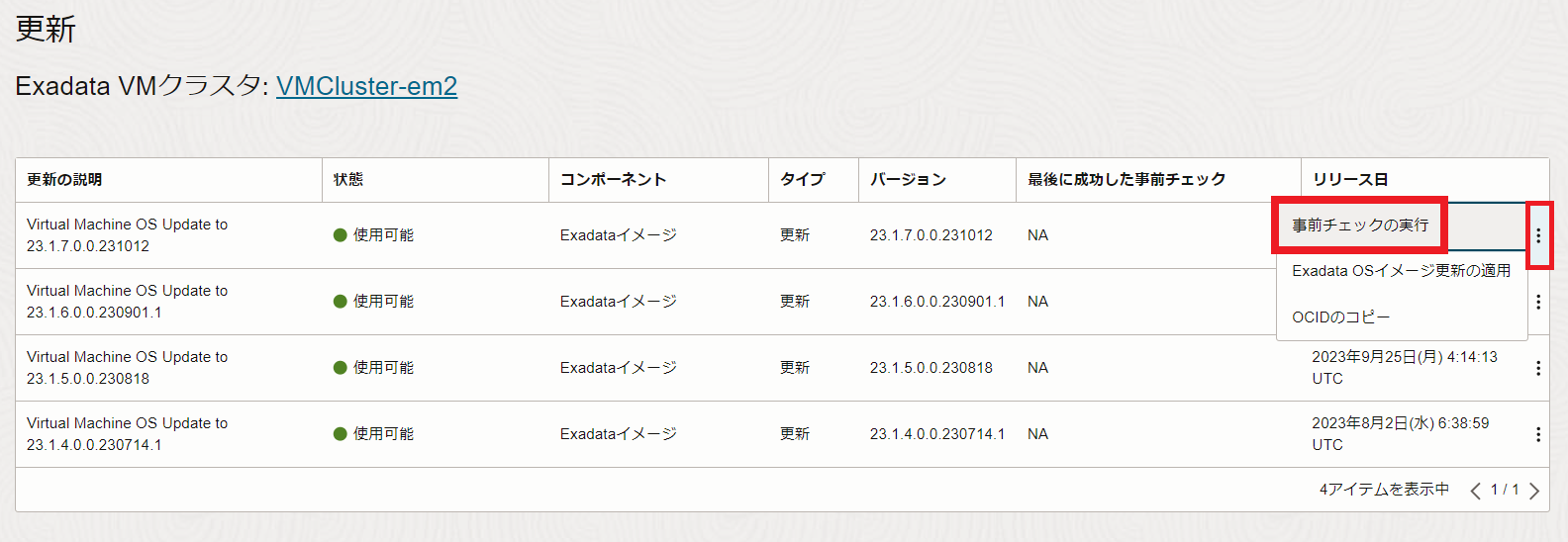 事前チェックで問題がなければ、アクション・ボタンをクリックして、Exadata OSイメージ更新の適用をクリックします。