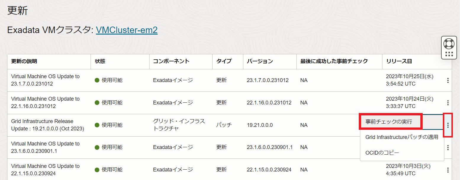 適用したいパッチの右のアクション・ボタンをクリックして、事前チェックの実行をクリックします。