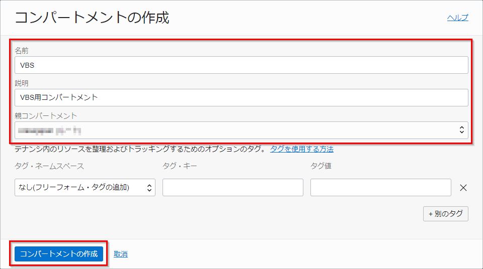 | 親コンパートメント | 作成するコンパートメントの親となるコンパートメントを選択します。今回はデフォルトのままにします。 |