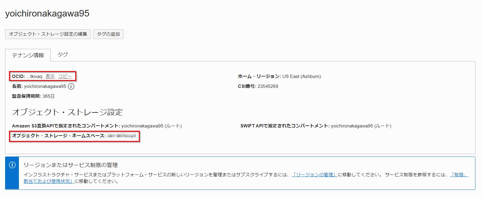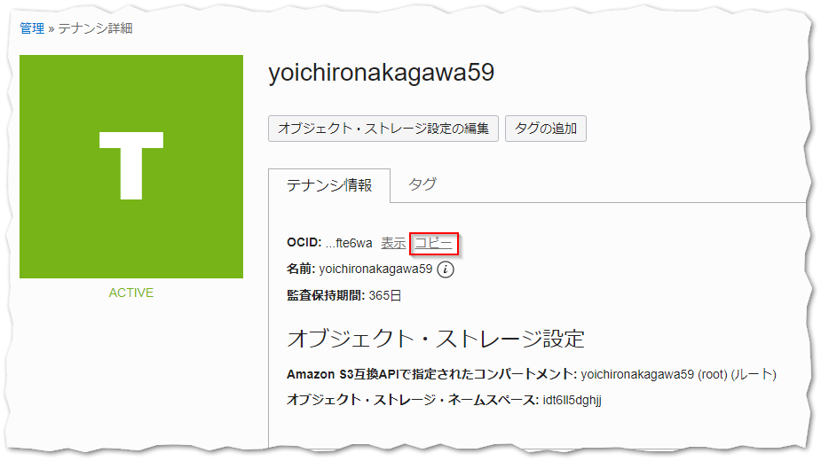 テナンシ情報"OCID"の右側にある"コピー"をクリックすると、テナンシOCIDがクリップボードにコピーされます。