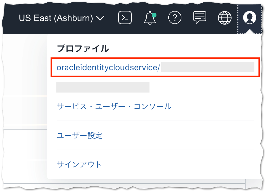 OCIコンソール画面右上の人型のアイコンをクリックし、展開したプロファイルから"ユーザ名”(oracleidentitycloudservice/<ユーザ名>)をクリックします。