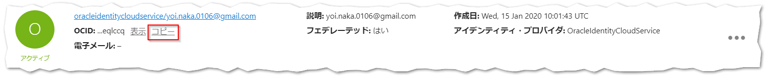 ユーザ情報が表示されますので、“OCID"の右側にある"コピー"をクリックすると、ユーザOCIDがクリップボードにコピーされます。