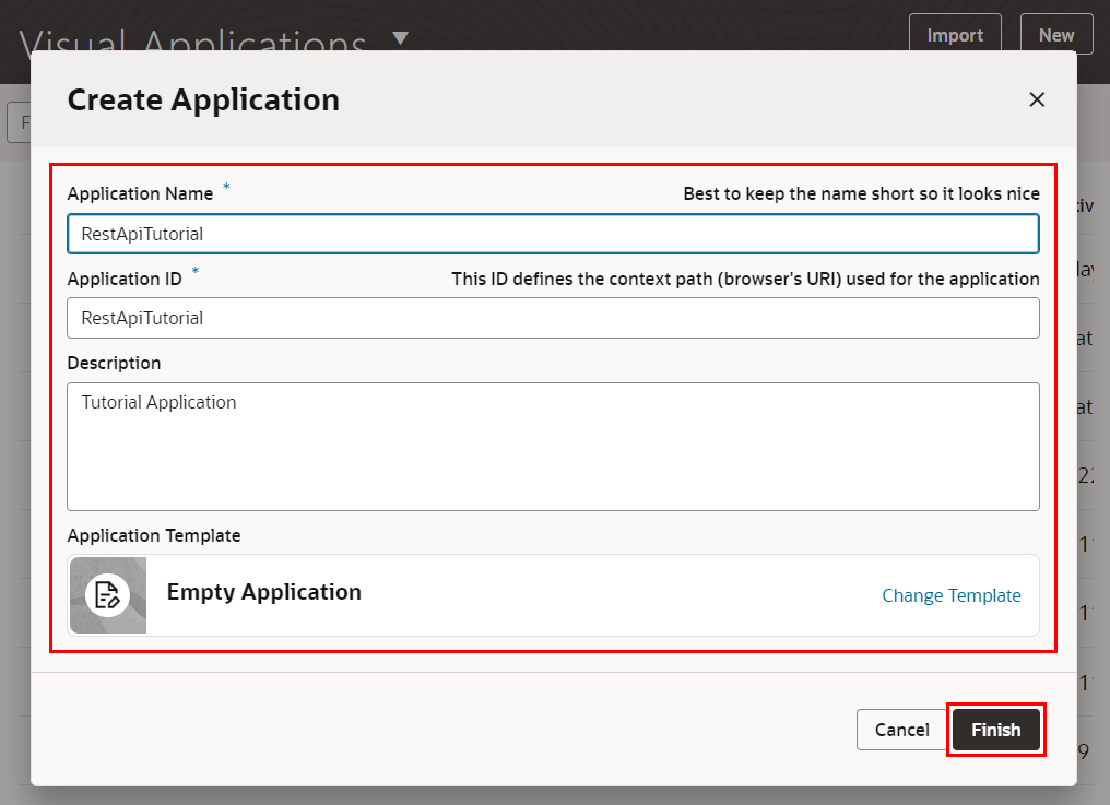 値を設定したら、「Create Application」 ダイアログ・ボックスの 「Finish」 ボタンをクリックします。