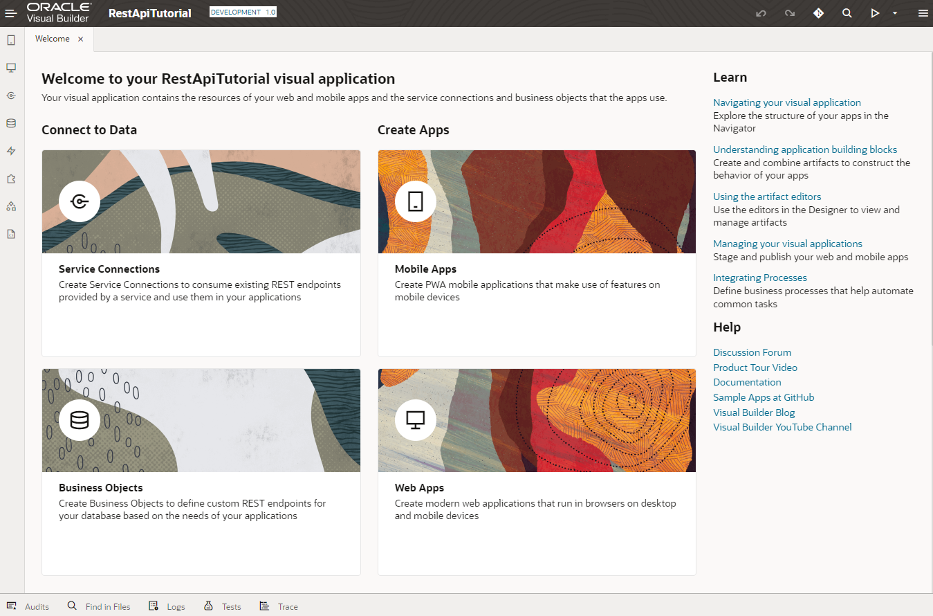 ビジュアル・アプリケーションが作成されると、VBCSのアプリケーション・デザイナでビジュアル・アプリケーションがオープンします。 アプリケーション・デザイナにはアーティファクト・ブラウザとWelcomeスクリーンが表示されます。 Welcomeスクリーンには、VBCSでアプリケーションを作成するためのタスクのガイドが表示されます。
