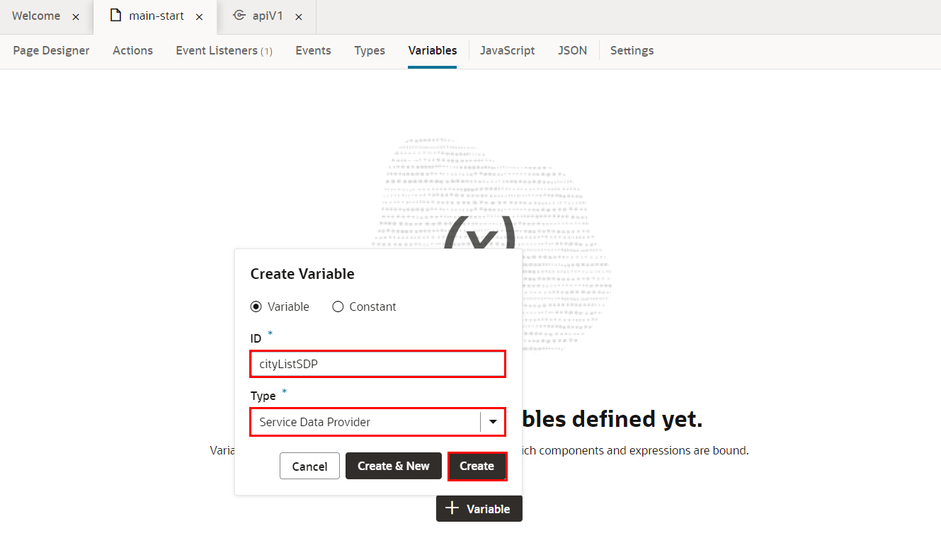 アプリケーション・デザイナの Variables タブをクリックします。 「+ Variable」 ボタンをクリックします。