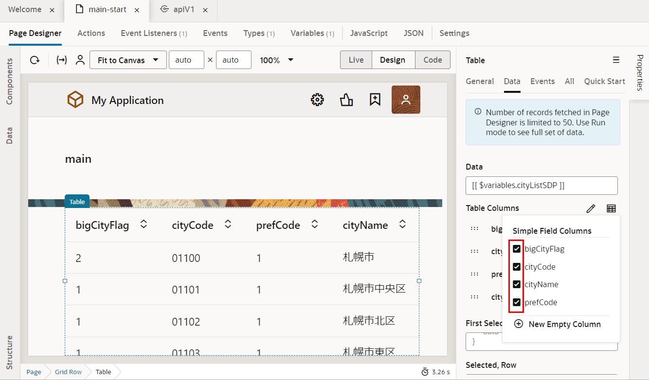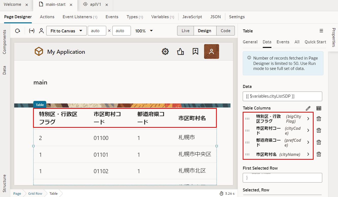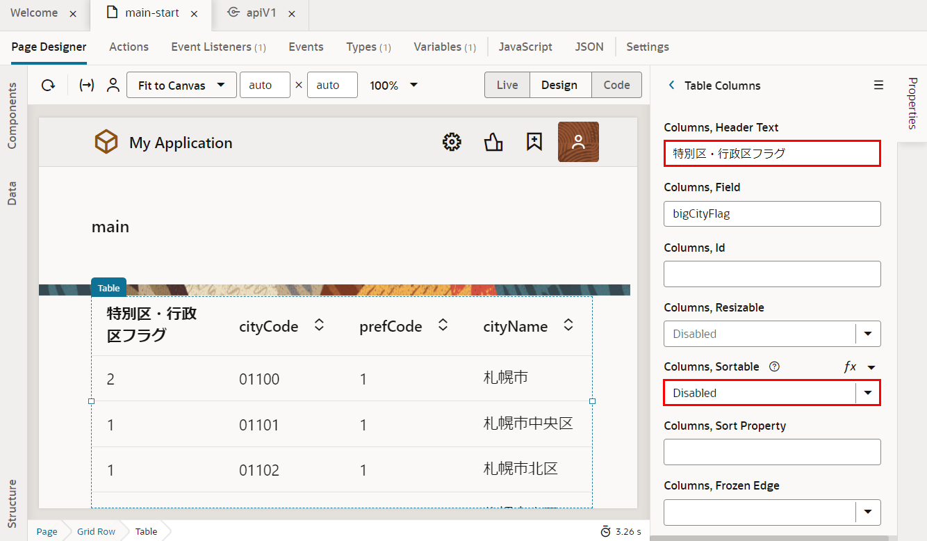 テーブルの列ヘッダーのテキストを変更します。「Table Columns」 リストの上から一番目の 「bigCityFlag」 の「>」をクリックして「Columns, Header Text」から 「特別区・行政区フラグ」 に変更し、「Columns, Sortable」から「Disabled」に変更します。