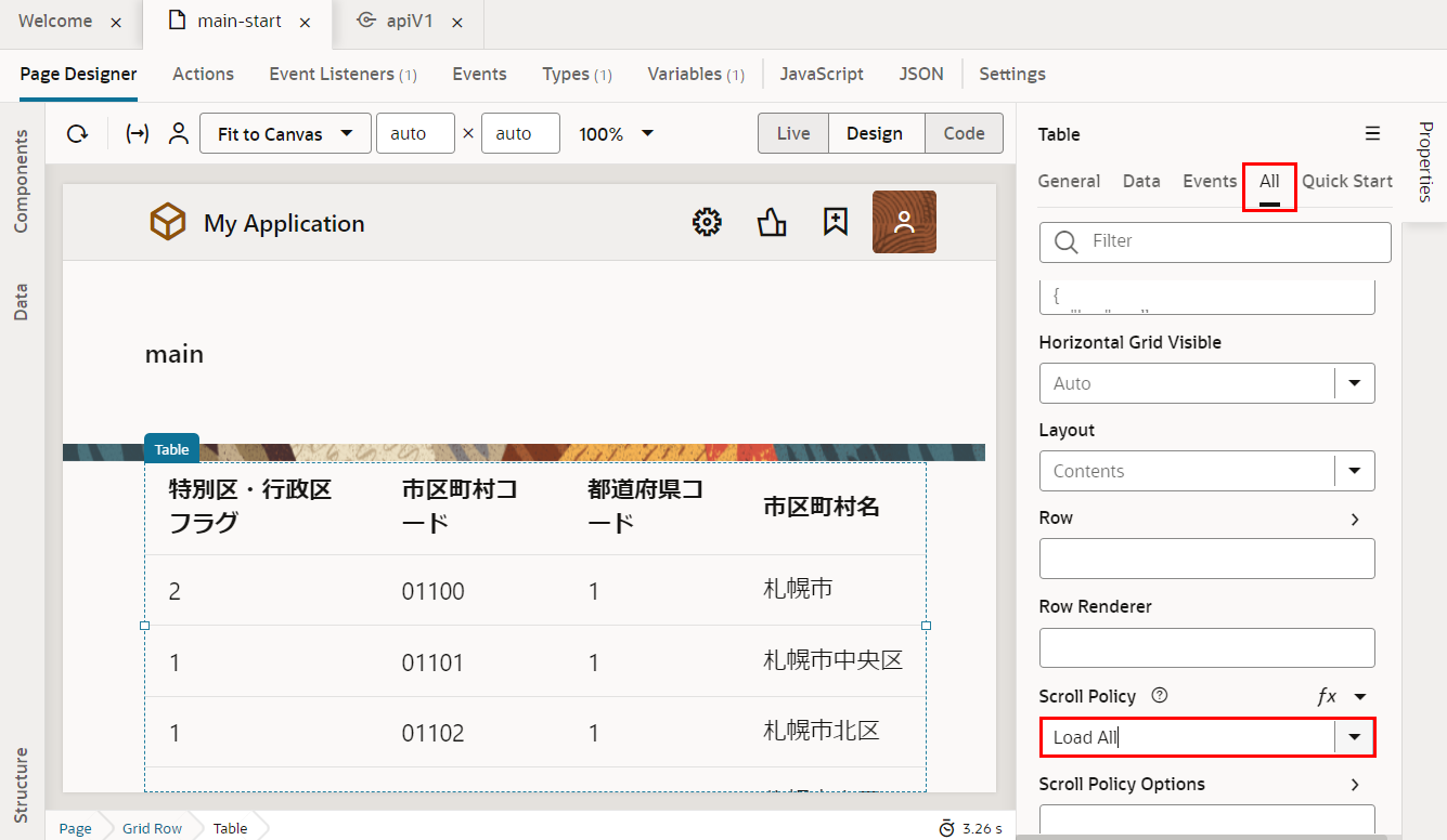 これから、テーブルのスクロール・ポリシーを変更します。Table コンポーネントのプロパティ・インスペクタで All タブを開きます。 下にスクロールし、「Scroll Policy」を「Load More On Scroll」から 「Load All」 に変更します。